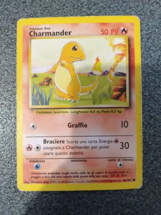Carta Pokémon Base di Charmander. - PV: 50 - Attacco: Graffio (10 danni) - Attacco: Braciere (30 danni) - Debolezza: Acqua - Resistenza: Fuoco - Costo di ritirata: 1 - Livello: 10 - Numero carta: 46/102