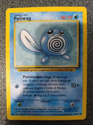 Carta Pokémon Base di Poliwag. - PV: 40 - Attacco: Pistolacqua - Debolezza: Fuoco - Resistenza: Elettro - Costo di ritirata: Incolore - Illustratore: Ken Sugimori - Numero carta: 59/102