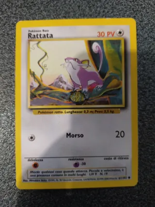 Carta Pokémon Base di Rattata, numero 61/102. - Attacco: Morso - PV: 30 - Costo di ritirata: 20 - Debolezza: Fulmine - Resistenza: Psico -30