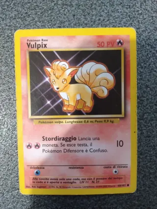 Carta Pokémon Base Vulpix con 50 PV. - Pokémon volpe. - Lunghezza: 0,6 m. - Peso: 9,9 kg. - Attacco: Stordiraggio. - Costo di ritirata: 10. - Debolezza: Acqua. - Livello: 11. - Numero carta: 68/102.