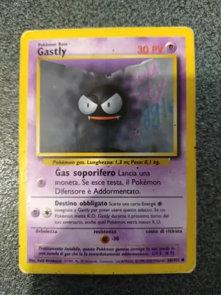Carta Pokémon Gastly della prima espansione Base Set. - Numero carta: 50/102 - Tipo: Pokémon Base - Attacco: Gas soporifero - Resistenza: -30 - Illustratore: Keiji Kinebuchi