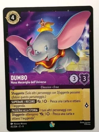 Carta Disney Lorcana del personaggio Dumbo. - Numero carta: 45/204 - Rarità: Leggendaria - Tipo: Classico, Eroe - Costo in inchiostro: 4 - Forza: 3 - Volontà: 3 - Illustratrice: Mariana Moreno