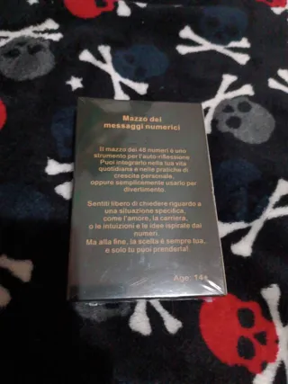 Carte da gioco con numeri e scritte. - Copertina verde scuro con numeri gialli. - Scritta Mazzo dei messaggi numerici in giallo.