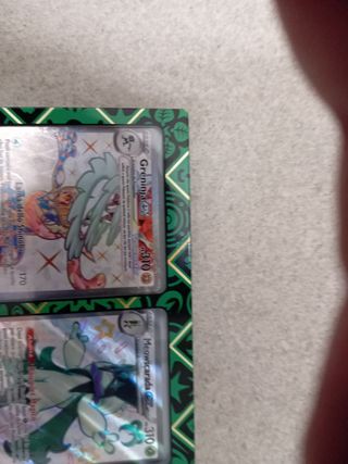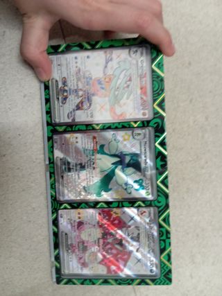 Bellissime carte Pokemon in perfette condizioni, inserite in un elegante portacarte. - Include 3 carte - Sono tutte in ottime condizioni. - Il portacarte è di colore verde scuro con decorazioni dorate.