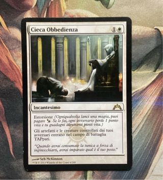 Carta Cieca Obbedienza per il gioco di carte Magic: The Gathering. - Edizione: Irruzione - Lingua: ITA - Tipo: Incantesimo - Costo di mana: 1W - Artista: Seb McKinnon - Edizione: 2013 Wizards of the Coast 6/249