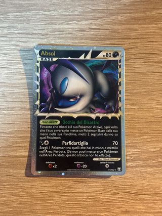 Carta Pokémon Absol Base. - Nome: Absol - Livello: Base - PV: 80 - Abilità: Occhio del Disastro - Attacco: Perfidartiglio (70 danni) - Debolezza: x2 - Resistenza: -20 - Illustratore: Hideaki Hakozaki - Codice carta: 91/102