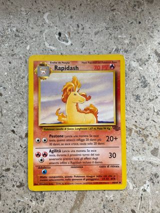 Carta Pokémon Rapidash, Fase 1, evoluzione da Ponyta. Questa carta ha 70 PV. - Attacco Pestone: infligge 20 danni più 10 danni se esce testa, altrimenti 20 danni. - Attacco Agilità: previene gli effetti degli attacchi avversari nel turno successivo. - Debolezza: fuoco. - Resistenza: nessuna. - Costo di ritirata: 30. - LV. 33 #78