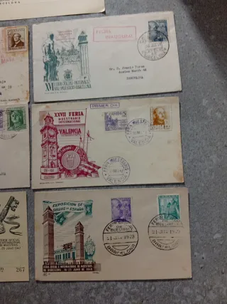 Set di 7 buste e cartoline postali a tema filatelico, risalenti agli anni '40. - Buste con francobolli e timbri da esposizioni. - Cartoline commemorative di eventi postali. - Disegni che includono treni, edifici e figure. - Varietà di francobolli spagnoli dell'epoca.