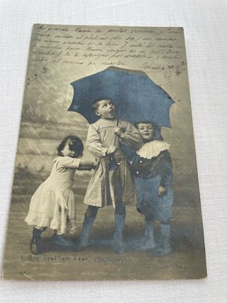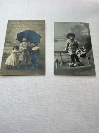 Set di due cartoline antiche con scene infantili. Una cartolina mostra tre bambini sotto un ombrello blu. L'altra cartolina presenta un bambino seduto su una panchina con fiori.