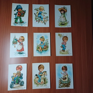Splendido set di 9 cartoline postali illustrate da Mary May. Ogni cartolina presenta incantevoli illustrazioni per bambini. Perfette per collezionisti di arte infantile. Mostrano scene quotidiane di bambini e bambine. Tutte le cartoline sono in buone condizioni, nessuna scritta.