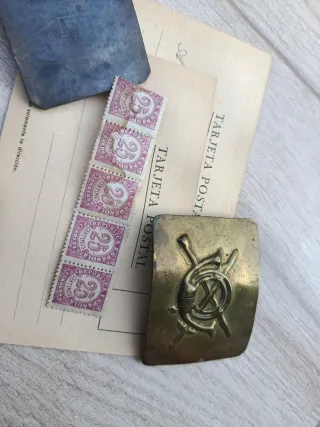 Raccolta di articoli relativi alla Guerra Civile Spagnola. - Cinque francobolli da 25 centesimi. - Due cartoline postali. - 2 fibbie, una di fanteria e un'altra liscia con le iniziali incise. J.O.L. Non hanno perni. Guerracivil/militaria/soldato/collezionismomilitare.