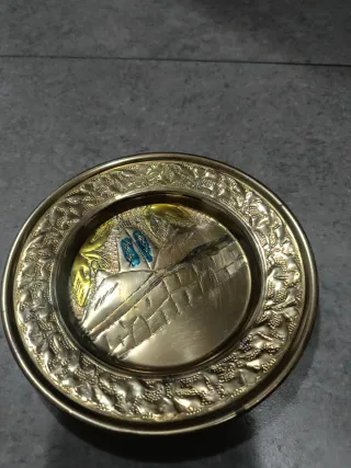 Grazioso piattino souvenir con decorazioni. - Bordo lavorato - Centro decorato con incisioni e inserti colorati (giallo, blu). - Design unico e dettagliato. Cm 15 Bronzo Lucidato