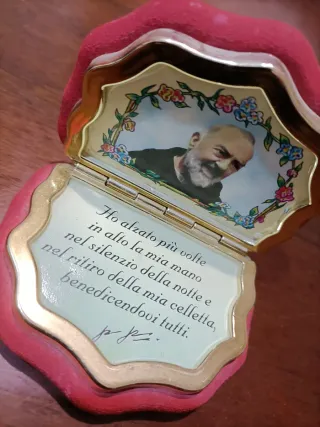 Soprammobile con immagine di Padre Pio e citazione Serve cambio mini batteria/non utilizzato da anni/ non so se va con cambio batteria