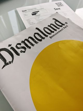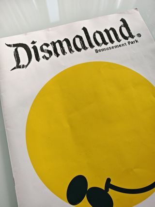 Catalogo del famoso parque de atracciones Dismaland. Il programma ufficiale di Banksy’s Dismaland. 64 pagine stampate a colori. Pieno di fotografia dal parco con opere d’arte, informazioni sull’artista, bio e molto altro dalla mostra. Uno dei pochissimi oggetti ufficiali che erano in vendita al salone ufficiale di Banksy nella città britannica di mare Weston Super Mare nel 2015. Presenta una copertina del viso sorridente dell'artista James Joyce. Dismaland era un 'parco di divertimento' come nessun altro, ideato e curato da Banksy sul sito di fatiscente sito fieristico. Più ticket d'ingresso - Edizione speciale.