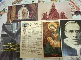 Lotto misto di cartoline, santini e francobolli. - Vari soggetti religiosi e storici. - Diverse annate e tipologie di francobolli. - Cartoline con immagini d'epoca.