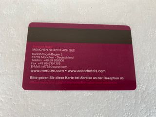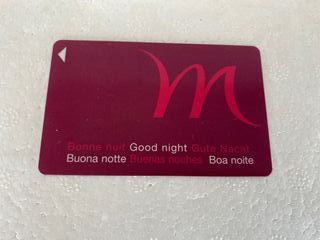 Chiave elettronica per hotel Mercure. - Colore: bordeaux - Logo M stilizzato - Scritta Buona notte in diverse lingue