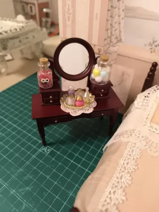 Set di mobili in miniatura per casa delle bambole. Include: letto matrimoniale con baldacchino, toeletta con specchio e accessori, specchio a terra, tappeto decorativo, cornice decorativa, vasi da fiori piccoli.