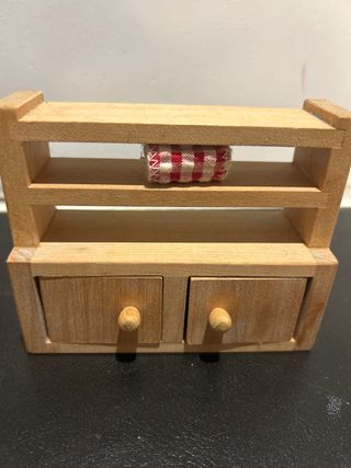 Mobile in legno per casa delle bambole, ideale per completare il soggiorno o la camera da letto. - Design a due ripiani. - Due cassetti frontali con maniglie rotonde. - Include una piccola cesta a quadri rossi e bianchi sullo scaffale superiore.