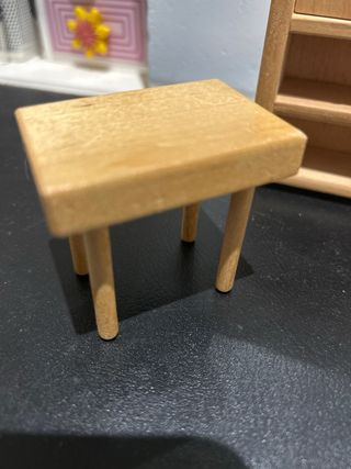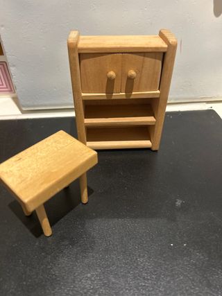 Set di mobili in legno per casa delle bambole, ideale per completare lo spazio. - Mobile con due porte e due ripiani. - Tavolo ausiliario con quattro gambe.