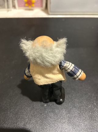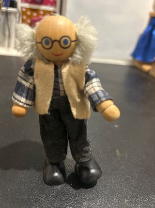 Figura di nonno per casa delle bambole, realizzata in legno. Design del personaggio anziano con occhiali. Abbigliamento a quadri e gilet. Capelli bianchi e occhi azzurri.