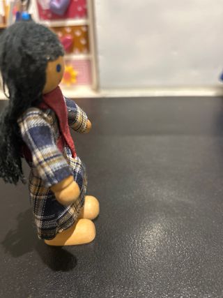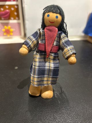 Figura di madre per casa delle bambole, realizzata in legno. Include un vestito a quadri blu e giallo, un gilet rosso, capelli neri e occhi azzurri.