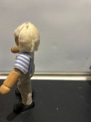 Figura in legno di un padre, ideale per case delle bambole. Corpo di legno. Vestito a righe blu e bianche. Pantaloni grigi. Scarpe nere.