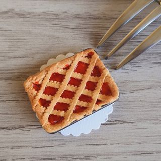Crostata in miniatura realizzata ca mano on paste polimeriche e resina; comprensiva di tovaglietta e cesto