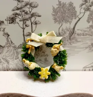 Piccola corona decorativa, perfetta per la casa delle bambole. Misura: cm 4 di diametro Le decorazioni sono in resina.