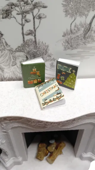 Set di tre libri in miniatura a tema natalizio, perfetti per la tua casa delle bambole. - Un libro verde con decorazioni natalizie e Merry Christmas!. - Un libro nero con un albero di Natale stilizzato e Merry Christmas!. - Un libro color crema con paesaggio invernale e la scritta CHRISTMAS. - Ideali per creare scene festive in scala.