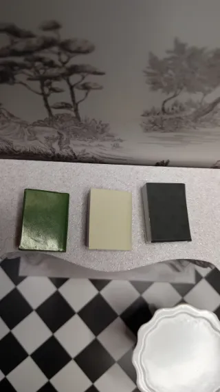 Set di tre libri in miniatura per la casa delle bambole. I libri si aprono. Pagine bianche. - Copertine decorate con motivi classici. - Ideali per arredare scenografie in scala.