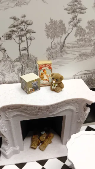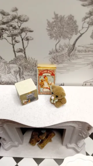 Set di mini giochi per casa delle bambole in stile vintage. Include un libro(non apribile),un orsetto e un dado decorato. Scala 1:12.