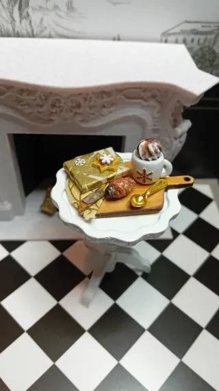 Tagliere a tema natalizio per casa delle bambole. Decorato con una tazza con cioccolato e panna, un piccolo regalo dorato, un biscotto glassato,una pigna, cucchiaino. Il tutto è incollato per una migliore resa. Misura cm 4 di lunghezza.