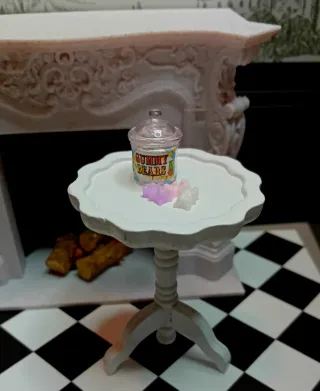 Barattolo in miniatura per casa delle bambole, con etichetta Gummy Bears. - Barattolo trasparente con coperchio. - Include tre orsetti gommosi colorati (viola e rosa).