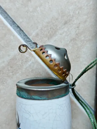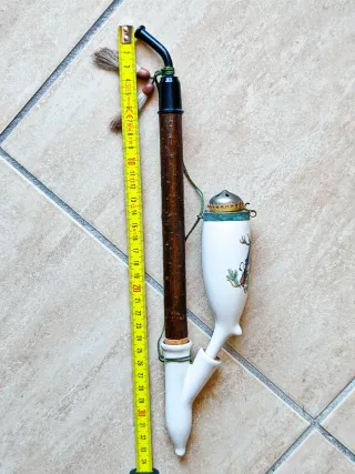 Questo è un antico arnese realizzato in ceramica e legno. - Parte in ceramica decorata con un cervo e vegetazione. - Parte in legno con finitura grezza. - Bocchino in plastica nera. - Dettagli decorativi in corda e nappe. Lunghezza 33 cm circa