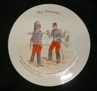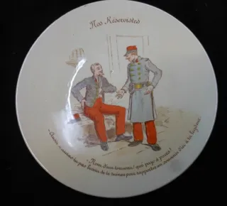 Piatto terraglia con Militari Soldati Nos Réservistes K. & G. Luneville (b) V2 Misure: diametro cm. 20 - peso gr. 260 - Raffigurazione di due soldati. - Scritta Nos Réservistes in alto. - Dicitura - Nom d'un tonneau! que pays à puces! - Aussi n'auras-tu pas besoin de le ruines pour rapporter un souvenir d'ici à la legitme. sul bordo.