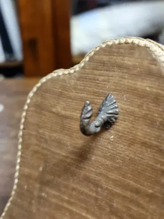 Oggetto tradizionale tipico olandese o tedesco, in legno, con finiture in metallo e cordino verde.