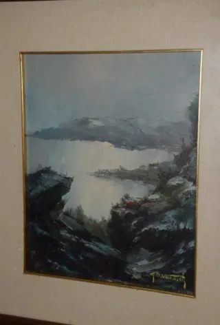 A. Santoro Pittore Secolo XX dipinto quadro paesaggio lacustre 15x29 C10 ^firmato in basso a destra A. Santoro, cm. 15x29, entro cornice, ingombro totale cm. 34x49 - peso gr. 1500