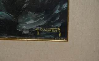 G.O. Vandelli (Modena Sec. XX) "Veduta di lago con pendio" cm. 30x24 Uf. 3 ^olio su compensato cm. 30x24 entro cornie condizioni: buone Dipinto Veduta di lago di G.O. Vandelli, artista modenese del XX secolo. L'opera raffigura un paesaggio lacustre con rocce. - Firma dell'artista in basso a destra.