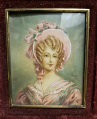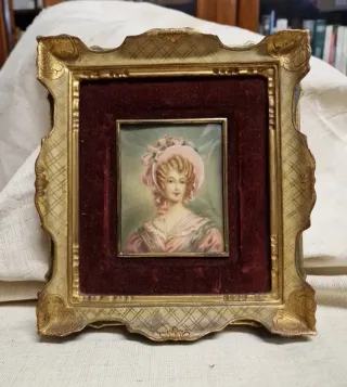 Miniatura Gentildonna Abito Rosa entro cornice V3 ^Firmata Vasco A. I. cm. 10x8 entro cornice in legno intagliato cm. 21x20 - peso gr. 260 Condizioni: buone - Dipinto a mano. - Cornice dorata con dettagli. - Passepartout in velluto bordeaux.