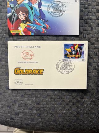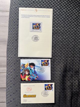 Set di tre articoli dedicati a Goldrake per il 50° anniversario. - Una busta con francobollo e annullo primo giorno di emissione. - Una cartolina illustrata con personaggi e Goldrake. - Un foglio con francobollo celebrativo Le Eccellenze del Patrimonio culturale italiano.