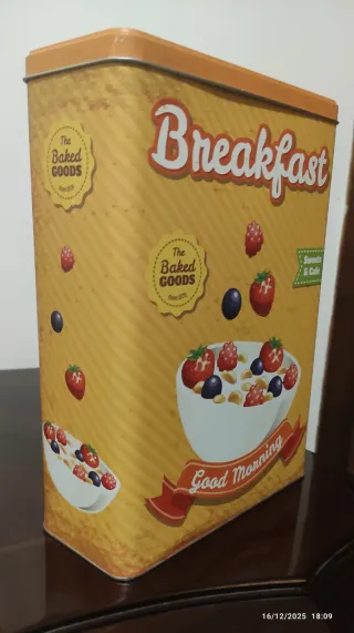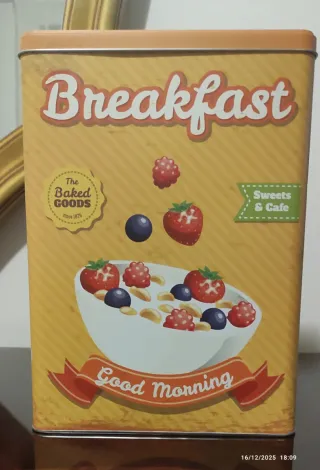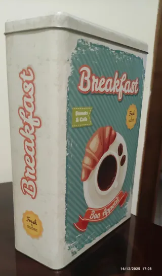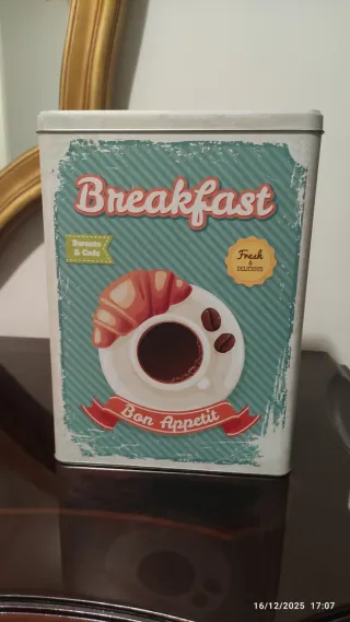 Elegante contenitore in latta con un design vintage a tema Breakfast. Perfetto per conservare biscotti, tè o altri piccoli oggetti.