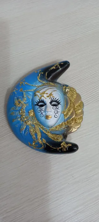 Bellissima decorazione in ceramica a forma di luna con una maschera. - Design unico con dettagli dorati. - Colori vivaci blu e oro. - Perfetta per aggiungere un tocco artistico alla casa.