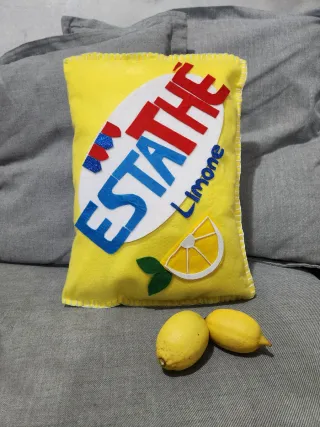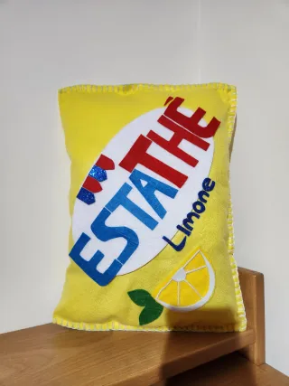 Cuscino decorativo unico ispirato alla bevanda Estathè al Limone. Realizzato a mano con cura. - Design originale e colorato. - Dettagli in feltro applicati a mano. - Perfetto per aggiungere un tocco di allegria a qualsiasi ambiente.