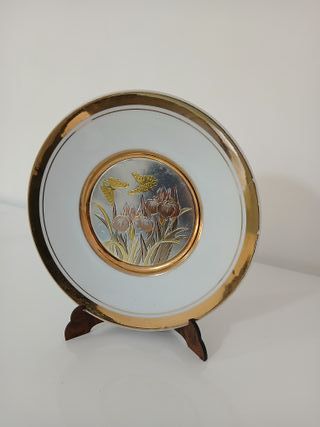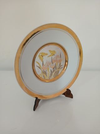 Elegante piatto decorativo The Art of Chokin con finiture in oro 24 carati. - Design con farfalle e fiori. - Bordo dorato. - Supporto in legno incluso. Piatto Decorativo The Art Of Chokin Oro 24 Kt Gold Porcellana Giapponese Vintage In buone condizioni come da foto in buone condizioni come da foto