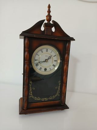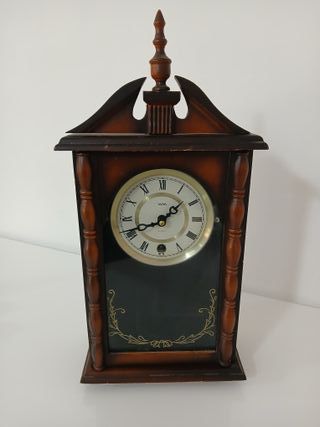 Elegante orologio da tavolo in legno con finitura anticata. Un pezzo d'arredo che aggiunge un tocco vintage alla tua casa. - Struttura in legno scuro. - Quadrante con numeri romani. - Dettagli decorativi in ottone sul vetro. Antico Orologio da Tavolo Muro In Legno WM Vintage Meccanico 30 cm In buone condizioni come da foto, senza pendolo, da testare / non funzionante