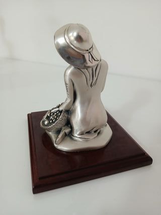 Elegante statuetta Romar Preziosi D'Arte laminata in argento. - Raffigura una ragazza con cappello e cesto di frutta. - Base in legno scuro lucido. Statuetta Romar Preziosi D'Arte Laminata in Argento Donna Cesto Frutta Vintage In buone condizioni come da foto