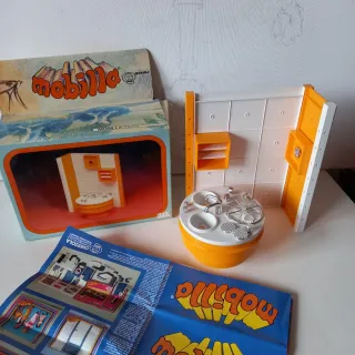 Bagno modulare componibile da gioco vintage anni 70. Marchio Mobilla Querzola. Aperto per la foto ma era sigillato e non ci ha giocato nessuno - Scatola originale inclusa. - Componenti del set da cucina. - Design colorato e retrò.