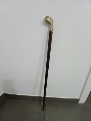 Elegante bastone da passeggio vintage con un manico a forma di testa di mazza. - Manico in metallo lucido. - Fusto in legno scuro. Raro Bastone da Passeggio in Legno Vintage Manico Testa Mazza Golf Metallo Sunday Club in buone condizioni come da foto