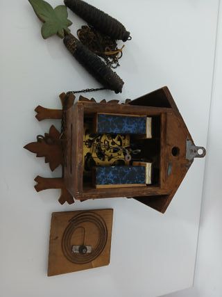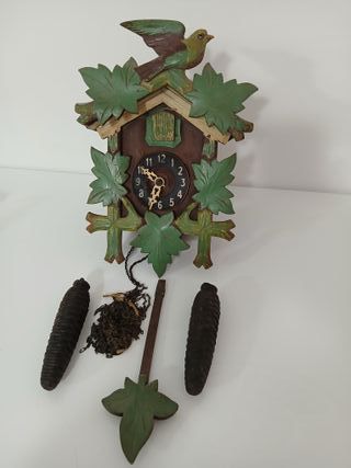 Antico orologio a cucù meccanico della Foresta Nera, pezzo da collezione. - Cassa in legno con decorazioni a tema. - Uccellino scolpito sul tetto. - Pendolo e pesi inclusi. Antico Orologio a Cucù Foresta Nera Meccanico Vintage in Legno In buone condizioni come da foto