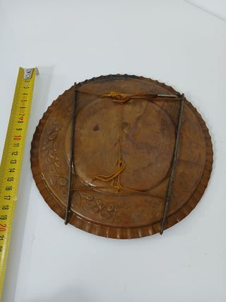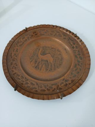 Piatto decorativo vintage in rame inciso con motivo di cammello. - Materiale: Rame - Tecnica: Incisione - Design: Cammello nel deserto Piatto Decorativo Vintage in Rame Inciso Motivo Cammello 20 cm In buone condizioni generali come da foto